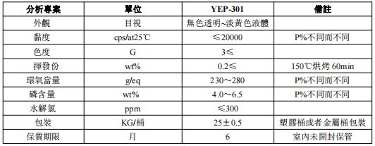 YEP-301系列系無溶劑、低(dī)粘度、高磷含量含(han)磷液態環氧樹脂(zhī),和一般環氧(yǎng)樹脂類似,適(shì)合配合各種各類(lei)的環氧樹脂固化(huà)劑、促進劑、填料(不(bu)推薦碳酸鹽類)、輔(fǔ)料以及各種溫度(dù)下的固化反應,製(zhi)造各種各類的無(wú)鹵阻燃環氧樹脂(zhi)產品。